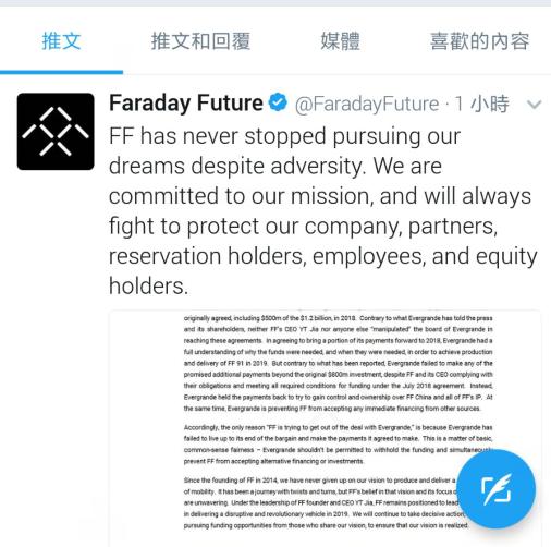 法拉第未來今日發(fā)布聲明稱,試圖擺脫恒大的唯一原因是,恒大沒能夠履行承諾和支付同意的款項。恒大不應該一邊扣留款項,一邊阻止FF接受其他投資。