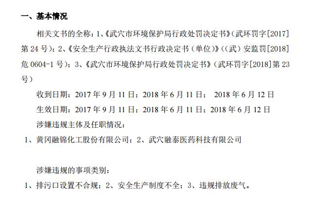 2、2018 年 1 月 22 日、3 月 22 日,武穴市安監(jiān)局安全監(jiān)察人員對黃岡融錦化工股份有限公司進(jìn)行安全檢查,公司安全制度不全、特種作業(yè)未建立票證制度 等,對公司給予罰款人民幣1萬元的行政處罰;