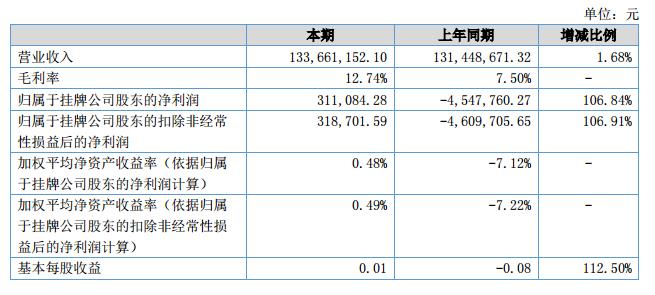 報(bào)告期內(nèi),公司實(shí)現(xiàn)營業(yè)收入13,366.12萬元,同比增長1.68%;實(shí)現(xiàn)凈利潤31.11萬元,同比增長106.84%;經(jīng)營活動(dòng)產(chǎn)生的現(xiàn)金流量凈流出為185.69萬元,凈流出減少24.01%;截止報(bào)告期末,公司總資產(chǎn)、凈資產(chǎn)分別為13,308.47萬元、6,754.41萬元,較上年同期分別增長2.37%、0.48%。?