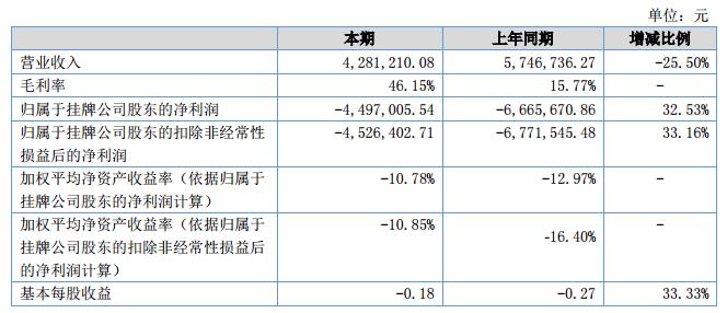 報(bào)告期內(nèi)公司總資產(chǎn)為6,947.10萬(wàn)元,較上年增加2.20%;實(shí)現(xiàn)營(yíng)業(yè)收入428.12萬(wàn)元,較上年同期下降25.50%;營(yíng)業(yè)成本為230.53萬(wàn)元,較上年同期下降52.38%,毛利率為46.15%,較上年同期增長(zhǎng)30.38%;凈利潤(rùn)-449.70萬(wàn)元,較上年同期增加32.53%;經(jīng)營(yíng)活動(dòng)產(chǎn)生的現(xiàn)金流量?jī)纛~為248.32萬(wàn)元,較上年同期增加2952.03%。?