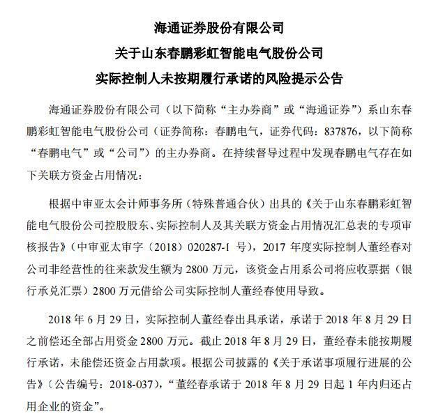 據(jù)主辦券商海通證券介紹,根據(jù)中審亞太會計(jì)師事務(wù)所(特殊普通合伙)出具的《關(guān)于山東春鵬彩虹智能電氣股份公司控股股東、實(shí)際控制人及其關(guān)聯(lián)方資金占用情況匯總表的專項(xiàng)審 核報(bào)告》,2017 年度實(shí)際控制人董經(jīng)春對公司非經(jīng)營性的往來款發(fā)生額為 2800 萬元,該資金占用系公司將應(yīng)收票據(jù)(銀行承兌匯票)2800 萬元借給公司實(shí)際控制人董經(jīng)春使用導(dǎo)致。