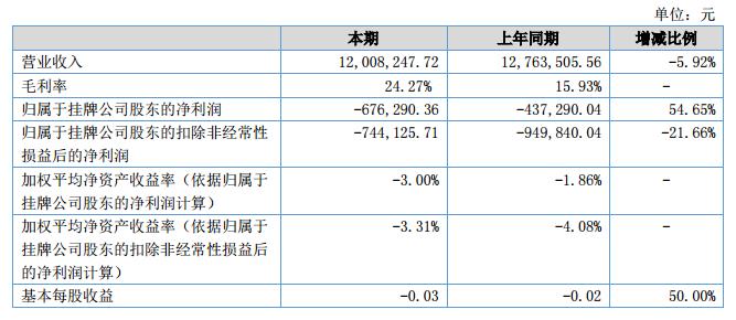 報(bào)告期內(nèi),財(cái)務(wù)狀況、經(jīng)營(yíng)成果的情況:2018年上半年,公司實(shí)現(xiàn)營(yíng)業(yè)收入12,008,247.72元,較上年同期12,763,505.56元,降低5.92%;銷(xiāo)售毛利率24.27%,較上年同期15.93%,增加8.34%。凈利潤(rùn)-676,290.36元,較上年同期-437,290.04元,降低54.65%。?