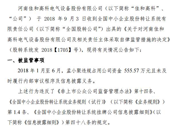 挖貝網(wǎng) 9月4日消息,新三板掛牌企業(yè)佳和高科(838149)董事長(zhǎng)孟小聚違規(guī)占用資金555.57 萬(wàn)元,未及時(shí)履行內(nèi)部審議程序和信息披露,被全國(guó)股轉(zhuǎn)公司出具警示函。
