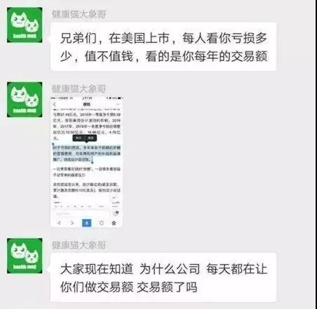 據(jù)有關(guān)人員提供的微信截圖,大象科技在微信朋友圈號召刷單,而且又打著“早日去美國上市”的旗號。據(jù)媒體報道,最后吸引了25萬名私教在健康貓app平臺上。