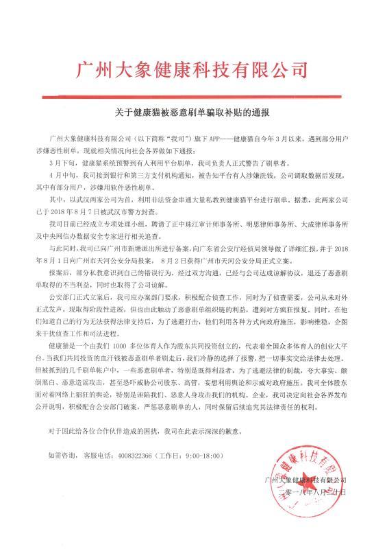 8月20日,大象科技在官方微博上中貼出一則《關(guān)于健康貓被惡意刷單騙取補貼的通報》,通告稱,以武漢兩家公司為首,平臺上的注冊私教“惡意刷單”涉嫌詐騙,并以此為由公開聲明停止提現(xiàn)。