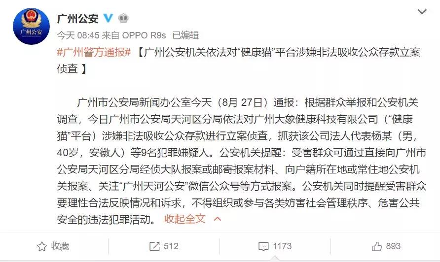 8月27日,廣州公安官方發(fā)布微博稱,對健康貓平臺運營方廣州大象健康科技有限公司涉嫌非法吸收公眾存款進行立案偵查,抓獲該公司法定代表人楊某等9名犯罪嫌疑人。