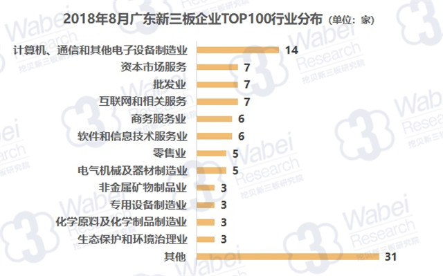 從行業(yè)分布來看,計(jì)算機(jī)、通信和其他電子設(shè)備制造業(yè)企業(yè)數(shù)量最多,有14家企業(yè);其次是資本市場(chǎng)服務(wù)、批發(fā)業(yè)、互聯(lián)網(wǎng)和相關(guān)服務(wù),均有7家企業(yè);商務(wù)服務(wù)業(yè)、軟件和信息技術(shù)服務(wù)業(yè)排名第三,均有6家企業(yè)。(來源:挖貝新三板研究院)