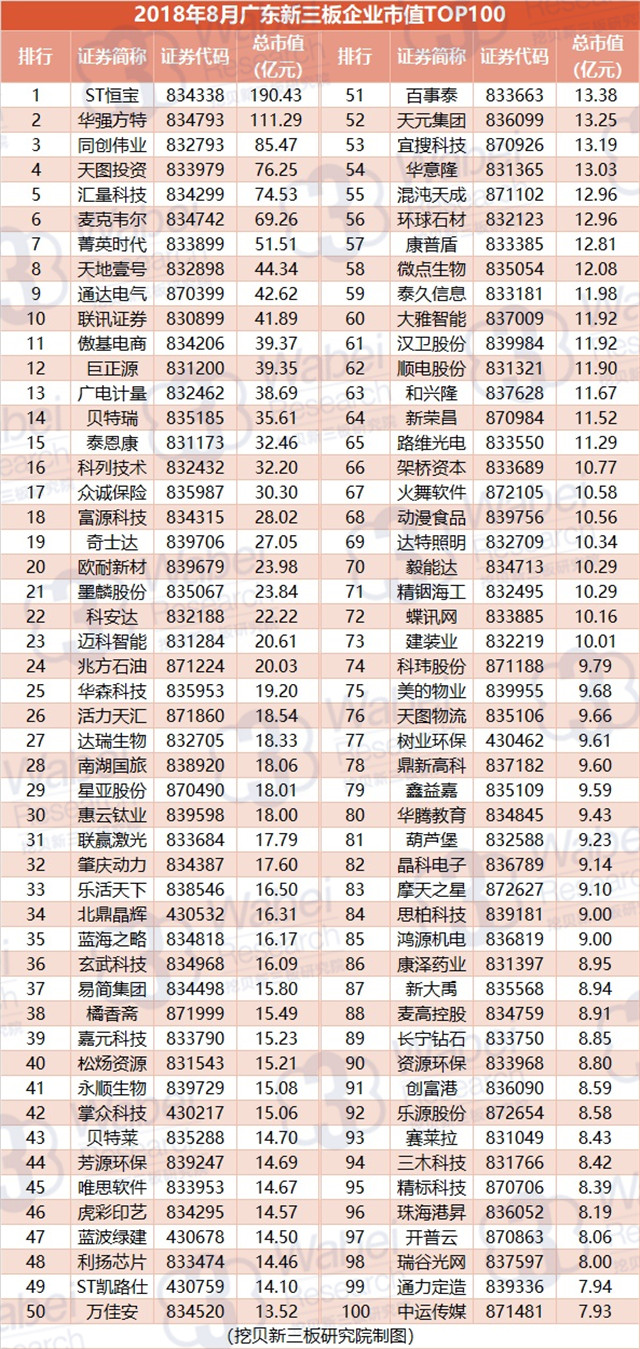 附:2018年8月廣東新三板企業(yè)市值TOP100