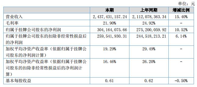 公司報(bào)告期內(nèi)實(shí)現(xiàn)營(yíng)業(yè)收入2,437,431,157.24元,比去年同期收入2,112,078,363.34元,增長(zhǎng)15.40%;凈利潤(rùn)分別為304,164,075.66元,比去年同期的275,200,059.92元增長(zhǎng)10.52%。報(bào)告期末,公司總資產(chǎn)為5,707,224,058.06元,凈資產(chǎn)為1,729,268,256.21元。?