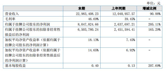 本報告期內公司經營業(yè)績有較大增長,實現(xiàn)營業(yè)收入22,983,408.23元,較去年同期增長90.88%;實現(xiàn)營業(yè)利潤8,225,568.77元,較去年同期增長174.39%;實現(xiàn)凈利潤8,047,824.66元,較去年同期增長205.11%;實現(xiàn)歸屬于掛牌公司股東的凈利潤8,047,824.66元,較去年同期增長205.11%。市場占有率得到有效提升。?
