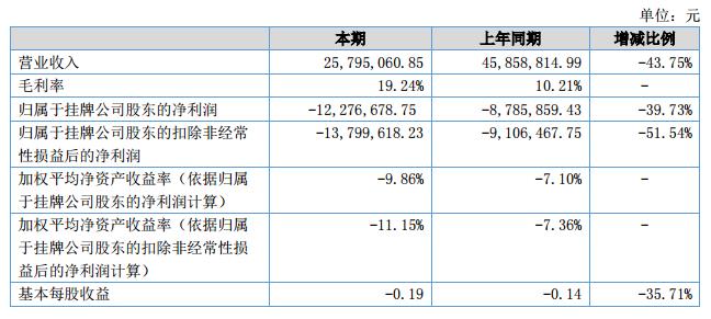 報告期內(nèi),公司實現(xiàn)營業(yè)收入2,579.51萬元,較上年同期減少43.75%;實現(xiàn)歸屬于公司股東的稅后凈利潤-1,227.67萬元,較上年同期減少39.73%。?