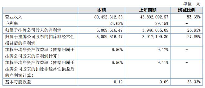 報告期內(nèi),2018年上半年實現(xiàn)銷售收入8049.23萬元,比去年同期增長83.39%;實現(xiàn)凈利潤500.95萬元,比去年同期增長26.95%。?