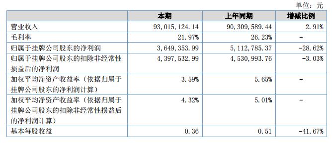 報告期內公司實現營業(yè)收入93,015,124.14元,上年同期營業(yè)收入為90,309,589.44元,較上年同期增2.91%;報告期內歸屬于掛牌公司股東的凈利潤為3,649,354.00元,上年同期歸屬于掛牌公司股東的凈利潤為5,112,785.37元,較上年同期下降28.62%。?