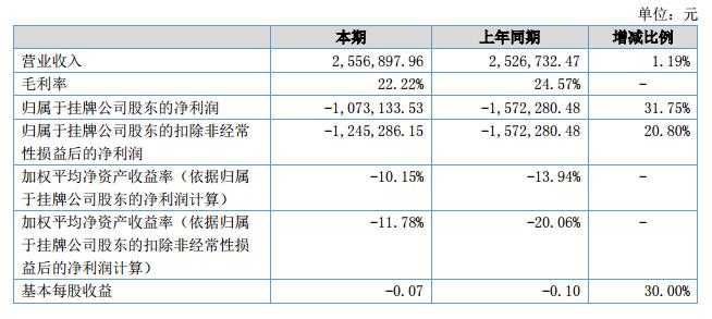 報(bào)告期內(nèi),公司實(shí)現(xiàn)收入2,556,897.96元,較上年同期增長1.19%,營業(yè)收入增長的主要原因是加大了市場拓展的力度和新產(chǎn)品開發(fā)的速度,產(chǎn)品訂單略有增加。凈利潤-1,073,133.53元,較去年同期增加31.75%。主要得益于成本費(fèi)用的有效控制。?