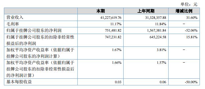 報(bào)告期內(nèi)公司實(shí)現(xiàn)營(yíng)業(yè)收入41,227,619.76元,同比上升31.60%?。
