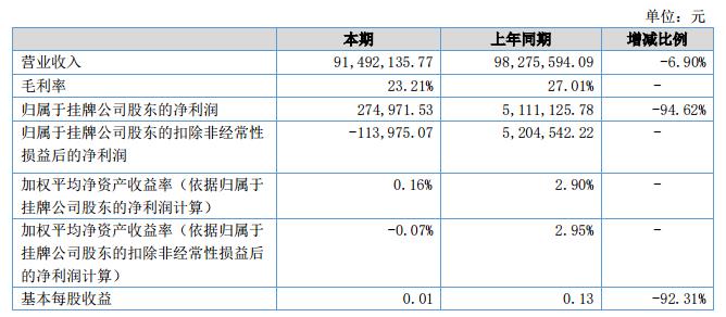 報告期內公司總資產305,763,876.15元,同比增長14.74%,歸屬于掛牌公司凈資產168,238,681.42元,同比上年增長-0.20%。報告期內實現(xiàn)銷售收入91,492,135.77元,同比上年下降-6.90%,歸屬于掛牌公司股東的凈利潤274,971.53元,同比增長-94.62%。?