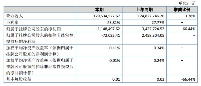 報(bào)告期內(nèi)公司實(shí)現(xiàn)營(yíng)業(yè)收入129534527.67元,比2017年同期增加3.78%;實(shí)現(xiàn)凈利潤(rùn)1148497.62元,比2017年同期減少66.44%。?