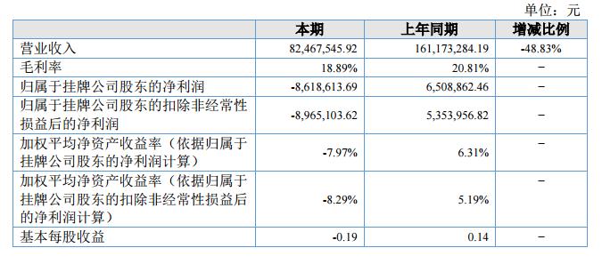 報告期內實現(xiàn)主營業(yè)務收入82,467,545.92元,較上年度下降48.83%;公司凈利潤為-8,919,236.50元,實現(xiàn)歸屬于掛牌公司股東的凈利潤為-8,618,613.69元。?