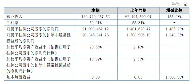 報(bào)告期內(nèi),公司業(yè)績經(jīng)歷了爆發(fā)式的增長,實(shí)現(xiàn)營業(yè)收入16,074.03萬元,同比增長155.98%;凈利潤2,188.04萬元,同比增長1970.44%。?