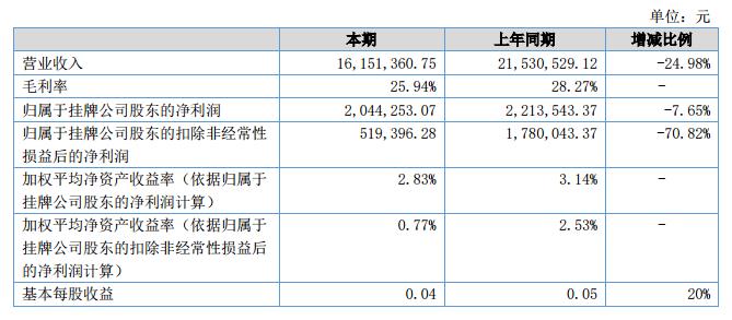 報(bào)告期內(nèi),公司實(shí)現(xiàn)營(yíng)業(yè)總收入16,151,360.75元,同比下降5,379,168.37元,下降幅度24.98%,其中機(jī)械類營(yíng)業(yè)收入10,928,449.31元,相比去年減少4,048,106.11元;冷鏈類營(yíng)業(yè)收入5,209,334.61元,相比去年減少1,344,639.06元。營(yíng)業(yè)總成本15,441,684.76元,同比下降4,129,769.02元,下降幅度21.10%。凈利潤(rùn)2,044,253.07元,同比下降169,290.30元,下降比例7.65%。經(jīng)營(yíng)活動(dòng)產(chǎn)生的現(xiàn)金流量?jī)纛~-1,594,818.53元,同比下降4,030,512.06元,下降比例165.48%。?
