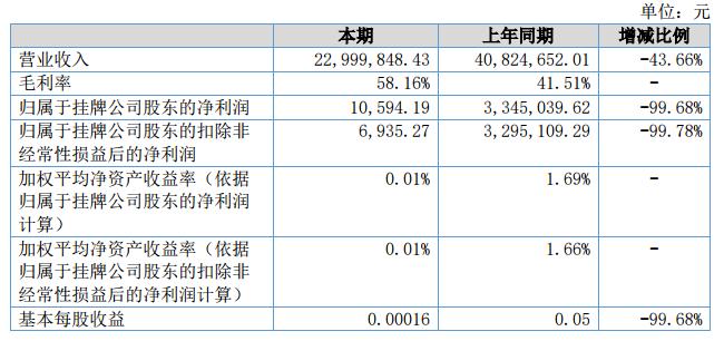 報告期內(nèi)營業(yè)收入22,999,848.43元,較上年同期40,824,652.01元,下降了43.66%;營業(yè)成本23,358,283.48元,較上年同期38,469,896.48元,下降了39.28%;歸屬于掛牌公司股東的凈利潤為10,594.19元,較上年同期3,345,039.62元,下降了99.68%。?