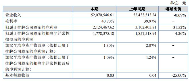 報(bào)告期內(nèi)公司實(shí)現(xiàn)營(yíng)業(yè)收入52,070,546.61元,同比下降0.69%;實(shí)現(xiàn)凈利潤(rùn)1,781,319.50元,同比下降26.45%。?