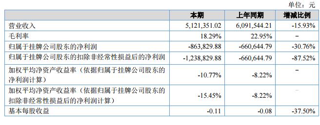 報告期內,公司實現(xiàn)營業(yè)收入512.14萬元,較上年同期減少15.93%;報告期內歸屬于公司股東的凈利潤為-86.38萬元,比上年同期減少了20.32萬元,增減比例為-30.76%。?