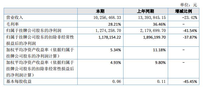 報告期內(nèi),公司實現(xiàn)營業(yè)收入1025.65萬元,較上年同期下降23.42%;公司實現(xiàn)凈利潤127.43萬元,較上年同期下降41.54%。?