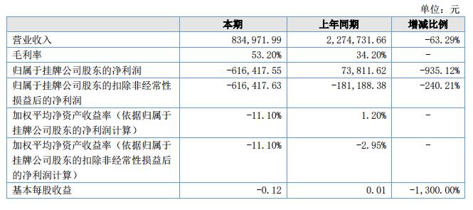 報告期內(nèi)公司實(shí)現(xiàn)營業(yè)收入834,971.99元,同比減少63.25%;營業(yè)成本390,769.14元,同比減少73.89%;凈利潤為-616,417.55元,同比減少935.12%。?