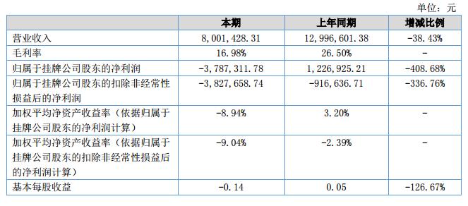 報告期內(nèi)公司主營業(yè)務(wù)收入合計800.14萬元,相比去年同期-38.43%;報告期內(nèi)實現(xiàn)凈利潤-378.73萬元,相比去年同期-408.68%,?