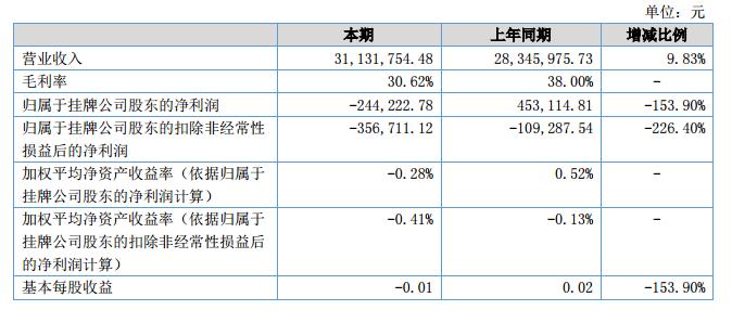 報告期內(nèi)公司營業(yè)收入金額31,131,754.48元,較上年同期上升了2,785,778.75元;?歸屬于掛牌公司股東的凈利潤-244,222.78元,與上年同期453,114.81元相比,下降了153.90%?