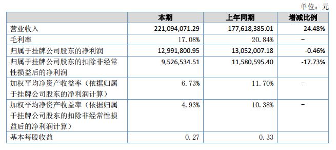 報(bào)告期公司實(shí)現(xiàn)營(yíng)業(yè)收入22,109萬(wàn)元,比上年同期增長(zhǎng)24.48%;報(bào)告期實(shí)現(xiàn)凈利潤(rùn)1,299萬(wàn)元,比上年同期下降0.46%。