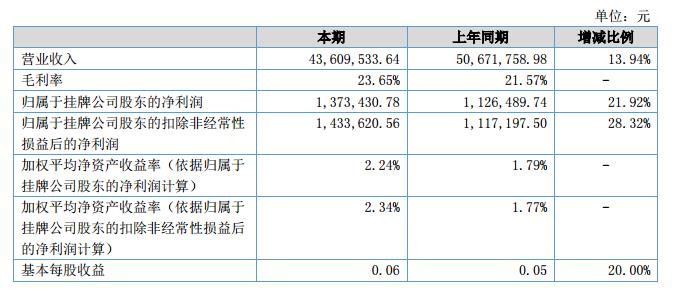 報告期內(nèi),公司的經(jīng)營狀況穩(wěn)步發(fā)展,截止2018報告期末,公司實(shí)現(xiàn)營業(yè)收入43,609,533.64元,較去年同期減少13.94%;公司的營業(yè)成本33,294,824.94元,較去年同期減少16.22%,報告期內(nèi)的凈利潤為1,373,430.78元,扭虧為盈,較去年同期增加21.92%。收入較上年減少13.94%。