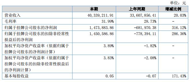 公司實(shí)現(xiàn)營(yíng)業(yè)收入40,339,211.91元,同比增長(zhǎng)20.03%,;公司實(shí)現(xiàn)歸屬于掛牌公司股東凈利潤(rùn)1,473,883.86元,同比增長(zhǎng)316.12%。