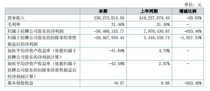 報告期內(nèi)公司營業(yè)收入23,027.20萬元,同比減少55.65%;營業(yè)成本15,782.04萬元,同比減少55.64%;凈利潤-5,846.02萬元,同比減少-833.46%。?