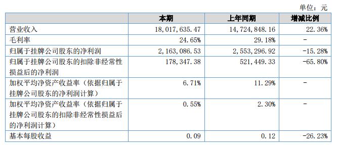 報(bào)告期內(nèi),公司實(shí)現(xiàn)營(yíng)業(yè)收入1801.76萬(wàn)元,比上年同期增加329.28萬(wàn)元,同比增加22.36%;營(yíng)業(yè)成本1357.69萬(wàn)元,比上年同期增加314.93萬(wàn)元,同比增長(zhǎng)30.20%;營(yíng)業(yè)利潤(rùn)55.98萬(wàn)元,比上年同期減少39.63萬(wàn)元,同比減少41.45%;利潤(rùn)總額254.46萬(wàn)元,比上年同期減少44.34萬(wàn)元,同比減少14.84%;凈利潤(rùn)207.14萬(wàn)元,比上年同期減少52.16萬(wàn)元,同比減少20.11%。?