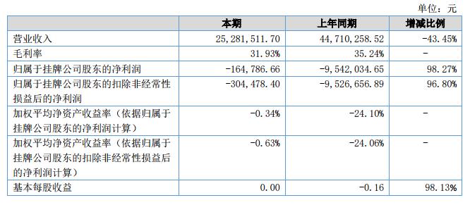 報(bào)告期內(nèi),公司實(shí)現(xiàn)營業(yè)收入2528萬元,較上年同期收入4771萬元有較大幅度的降低;凈利潤-76.7萬元,較上年同期凈利潤(-960.8萬元)大幅度減虧。