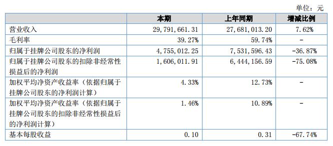 報告期內(nèi),公司實現(xiàn)營業(yè)收入29,791,661.31元,,較上年同期增加2,110,648.11元,增幅7.62%;凈利潤為4,755,012.25元,較上年同期減少2,776,584.18元,降幅36.87%。?