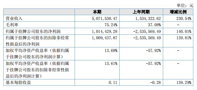 報(bào)告期內(nèi),公司實(shí)現(xiàn)營業(yè)收入507.15萬元,凈利潤(rùn)101.44萬元,收入比上年同期增長(zhǎng)230.54%利潤(rùn)也由虧損轉(zhuǎn)為盈利,基本每股收益報(bào)告期為0.11元,上期為-0.28,綜合毛利率75.24%,報(bào)告期內(nèi)經(jīng)營情況呈良性趨勢(shì)發(fā)展。?