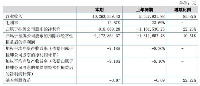 本期公司營(yíng)業(yè)收入10,268,162.40元,上年同期營(yíng)業(yè)收入5,537,931.98元,收入增長(zhǎng)85.87%;實(shí)現(xiàn)凈利潤(rùn)-918,869.28元,上年同期-1,181,530.25元。凈利潤(rùn)同比增長(zhǎng)22.23%。