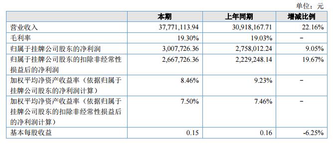 報告期內(nèi)公司營業(yè)收入為3,777.11萬元,同比增長22.16%;公司實現(xiàn)歸屬于掛牌公司股東的凈利潤為300.77萬元,較上年增加24.97萬元,同比增長9.05%。?