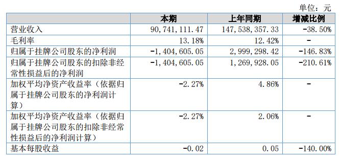 報告期內(nèi)公司實現(xiàn)銷售收入90,741,111.47元,較上年下降38.50%,凈利潤-1,059,122.28元,較上年下降135.31%,收入和利潤較上年同期均有所下降。?