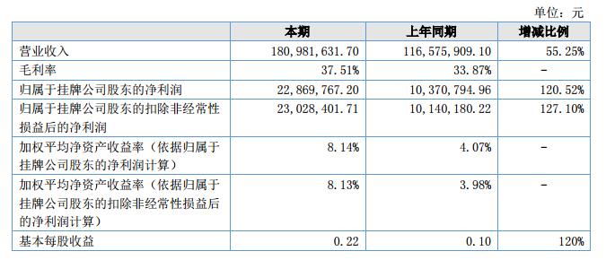 報(bào)告期內(nèi),公司實(shí)現(xiàn)營(yíng)業(yè)收入180,981,631.70元,比上年同期116,575,909.10元,增長(zhǎng)55.25%;實(shí)現(xiàn)凈利潤(rùn)22,869,767.20元,比上年同期10,373,804.48元,增長(zhǎng)120.46%。?
