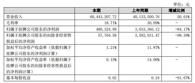 報(bào)告期內(nèi),公司共實(shí)現(xiàn)營業(yè)收入60,443,207.72元,較上年同期增長50.61%;實(shí)現(xiàn)凈利潤967,637.41元,較上年同期下降68.30%;營業(yè)成本為49,135,450.04元,較上年同期上升75.13%;產(chǎn)品毛利率由上年同期的30.09%下降為18.71%。?