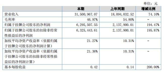 報告期內(nèi)新簽合同7000余萬元,實(shí)現(xiàn)營業(yè)收入3,150.10萬元,比去年同期1809.40萬元增長了74.10%,歸屬于掛牌公司股東凈利潤增加424.77萬元,比去年同期增長207.43%。資產(chǎn)總額增長7.36%,負(fù)債總額下降20.08%,凈資產(chǎn)增長23.80%。?