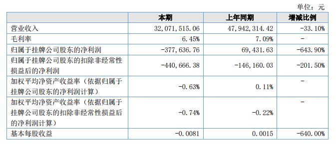 報(bào)告期內(nèi),公司實(shí)現(xiàn)營(yíng)業(yè)收入3,207.15萬(wàn)元,同比減少33.10%;毛利率為6.45%,凈利潤(rùn)-37.76萬(wàn)元,較上年同期下降643.90%。