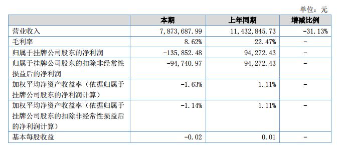 報(bào)告期內(nèi)公司營業(yè)收入7,873,687.99元,較去年同期有所下降;營業(yè)成本為7,195,047.18元,與上年同期相比減少1,669,313.02元,降幅18.83%?;凈利潤為-135,852.48元?。