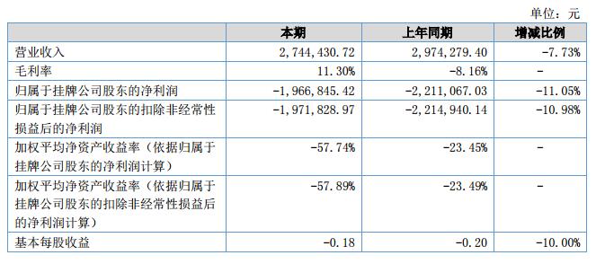 報(bào)告期內(nèi)公司主營業(yè)務(wù)收入為2,744,430.72元,比去年同期下降7.73%;營業(yè)成本為2,434,290.86元,比去年同期下降24.33%;歸屬母公司的凈利潤為-1,966,845.42元,比上年同期凈利潤-2,211,067.03元虧損金額減少了11.05%?