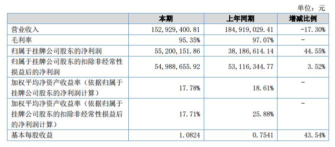 報告期內公司實現營業(yè)收入15,292.94萬元,較去年同期下降17.30%,同時公司實現凈利潤5,520.02萬元,同比增長44.55%。?
