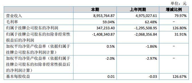 報告期內(nèi)公司完成營業(yè)收入895.38萬元,同比增長79.97%;營業(yè)成本366.79萬元,凈利潤31.08萬元,同比增長123.6%;經(jīng)營活動產(chǎn)生的現(xiàn)金流量凈額-296.23萬元。?